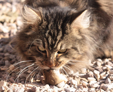 Zentral in unserer Fütterung sind Mahlzeiten aus Fleisch, Innereien und Knochen. Dabei orientieren wir uns in der Zusammensetzung an den Verhätnissen, wie sie in der Beute von Katzen vorliegen. Man bekommt Futterfleisch vom Spezialhandel portioniert und eingefroren bequem nach Hause geliefert. Die für Katzen essentielle Aminosäure Taurin sowie etwas Pflanzenöl und eine Prise Salz wird noch hinzugefügt und ergibt so eine vollwertige, frische Nahrung. Sehr gern fressen unsere Katzen auch Fisch.